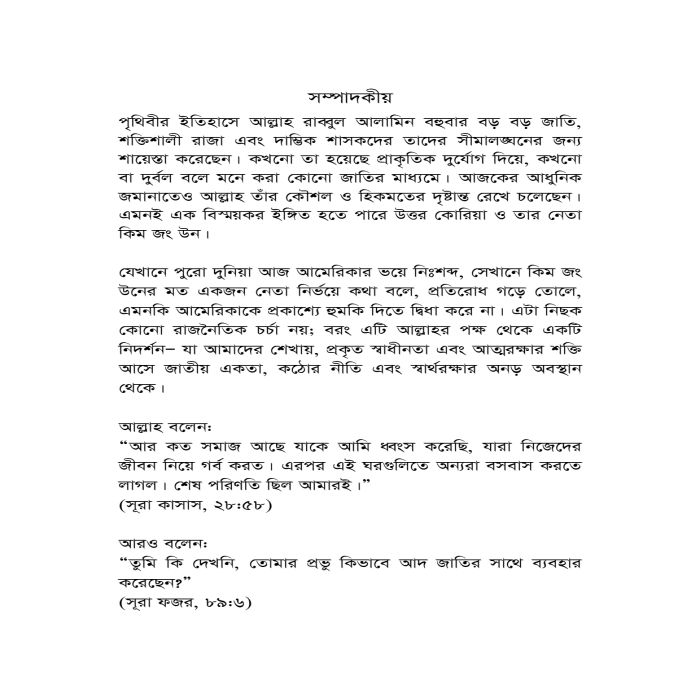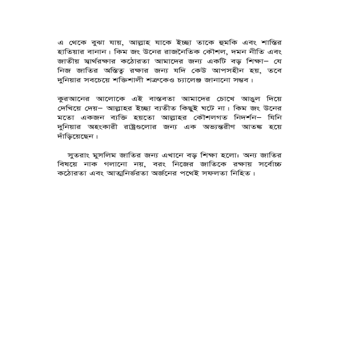 যেখানে পুরো দুনিয়া আজ আমেরিকার ভয়ে নিঃশব্দ, সেখানে কিম জং উনের মত একজন নেতা নির্ভয়ে কথা বলে, প্রতিরোধ গড়ে তোলে, এমনকি আমেরিকাকে প্রকাশ্যে হুমকি দিতে দ্বিধা করে না। এটা নিছক কোনো রাজনৈতিক চর্চা নয়; বরং এটি আল্লাহর পক্ষ থেকে একটি নিদর্শন- যা আমাদের শেখায়, প্রকৃত স্বাধীনতা এবং আত্মরক্ষার শক্তি আসে জাতীয় একতা, কঠোর নীতি এবং স্বার্থরক্ষার অনড় অবস্থান থেকে।